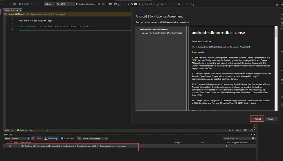 While building the project, we will get license agreement screen only for the first time as shown below.
