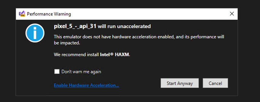 After completion of download, we will option to run the emulator. However, there will be a warning about performance as shown.