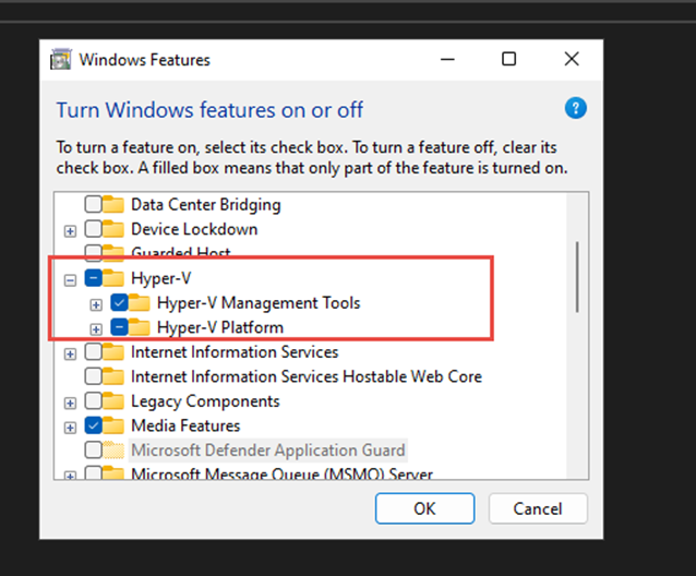 • Enable Window Features: Hyper-V and Windows Hypervisor Platform.