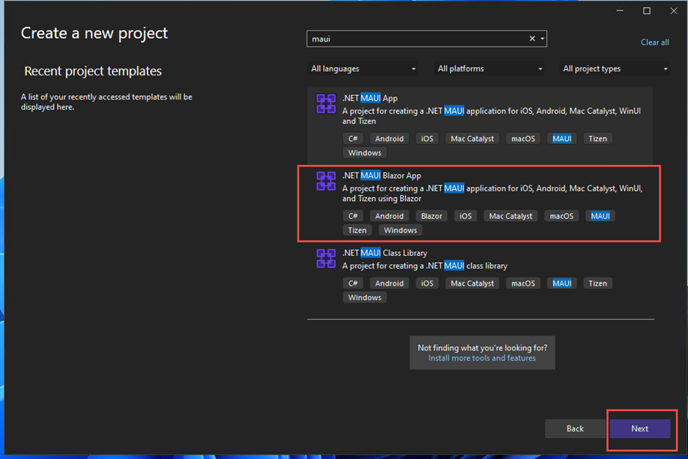 We will create a new project screen. Then we will search MAUI project templates and choose .NET MAUI Blazor App as portrayed below.